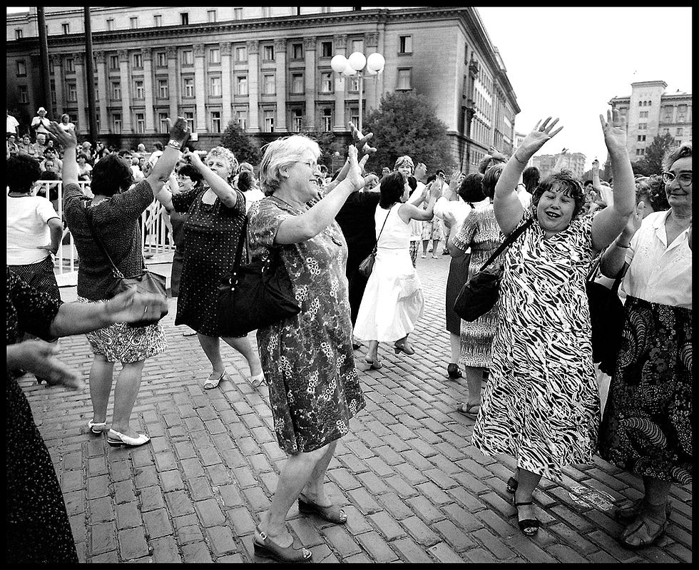 Middle: Bye-bye Berlin Wall, November, 1989; Bulgarians dancing in the street in Sofia after Communist Party headquarters was burned, August, 1990.